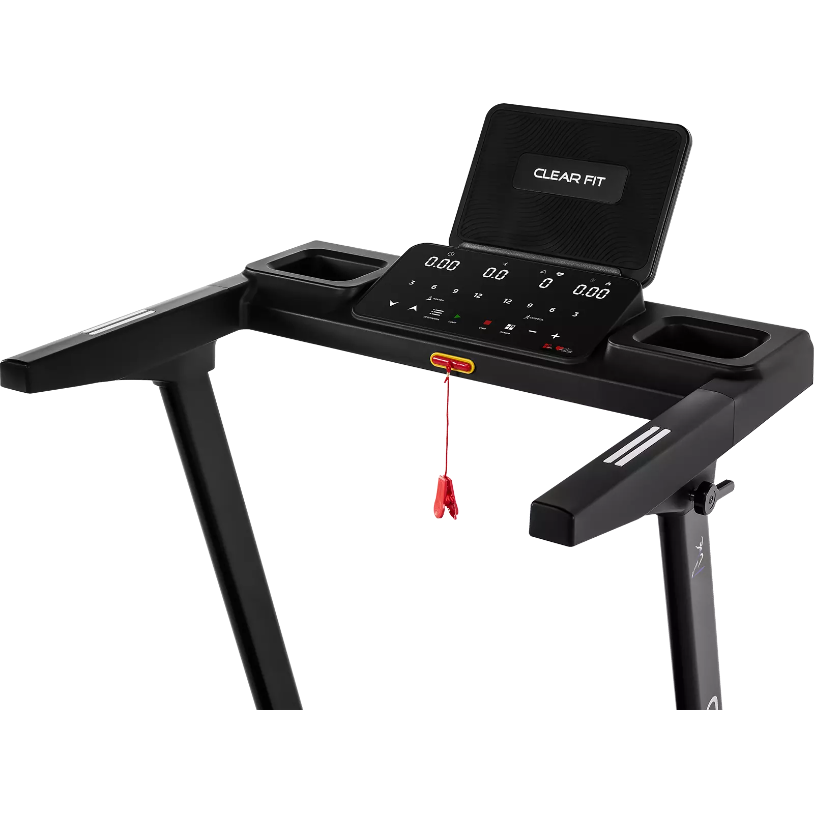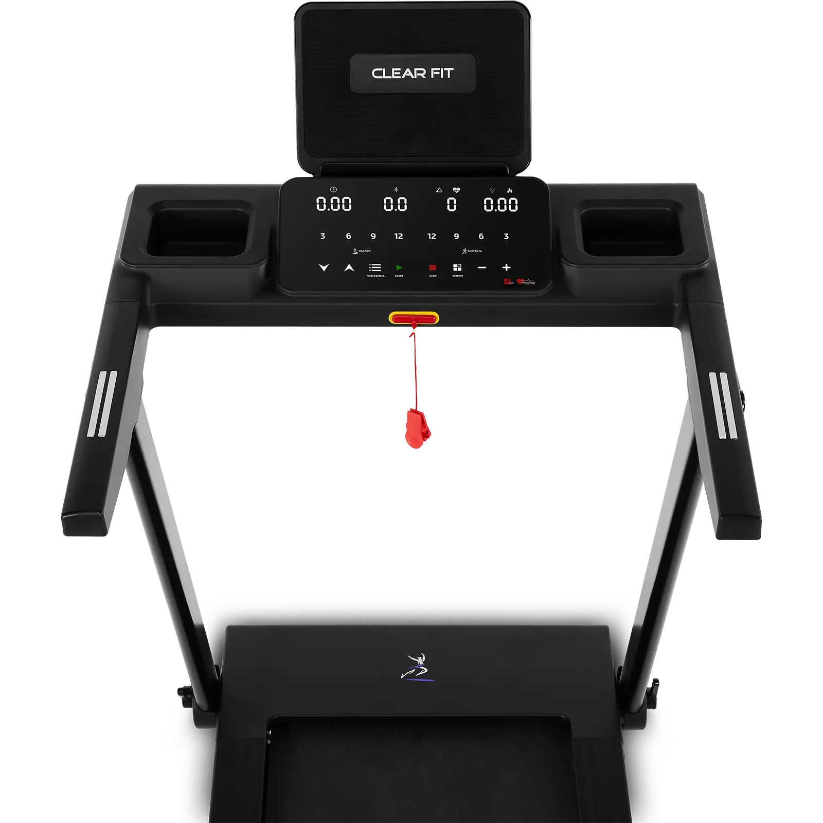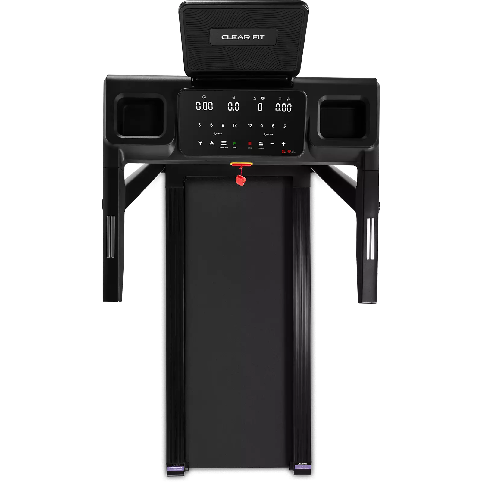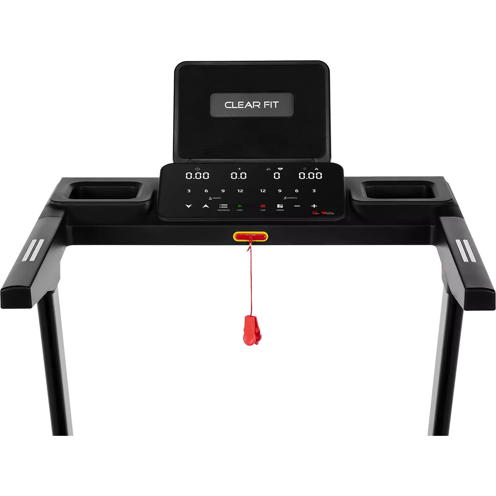 Консоль отличается простой, удобной системой управления и четырьмя современными LED экранами. Легкочитаемые дисплеи отображают основные параметры тренировки: время, скорость, дистанция, калории и пульс. Русифицированное управление облегчает настройку программ, контроль и проведение тренировок. Оптимальный пакет программ повышает эффективность тренировок, помогает сохранить мотивацию и интерес к занятиям. На поручнях беговой дорожки расположены датчики пульса.