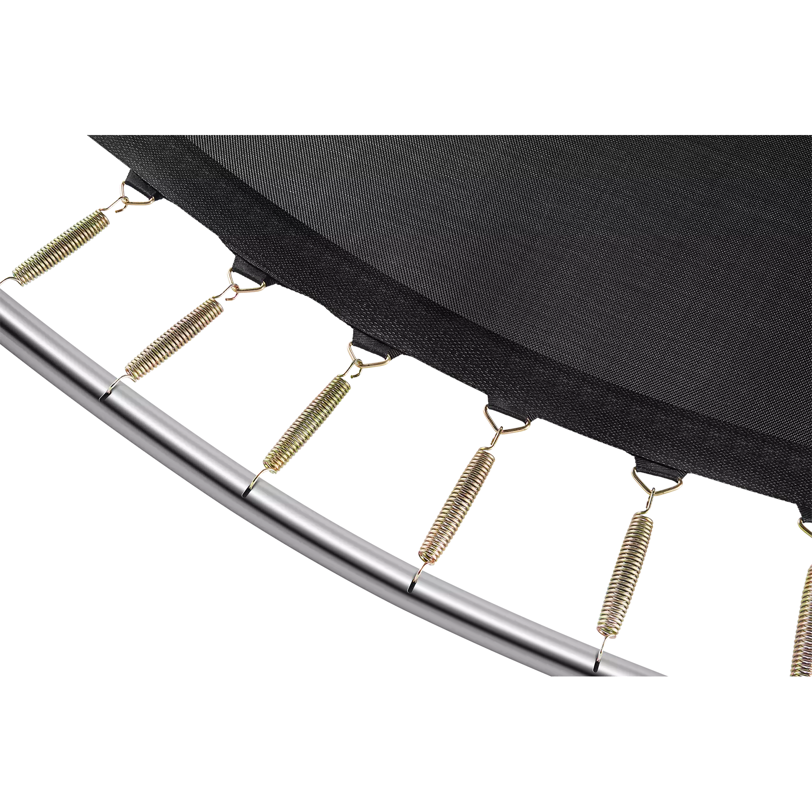 Пружины сделаны из гальванизированной стали толщиной 3 мм. Они устойчивы к коррозии и долго служат. Длина каждой пружины — 130 мм. Для батута размером 10 футов требуется 54 пружины по периметру. Это обеспечивает оптимальную амплитуду и безопасность для нагрузки до 160 кг. Пружинный механизм защищен мягким многослойным матом шириной 260 мм. Мат полностью закрывает раму, пружины и все твердые элементы. Он состоит из трех слоев: внутренний — мягкий амортизирующий слой EPE толщиной 10 мм, нижний — термостойкий слой (PE) и верхний — из износостойкого негорючего влаго и погодостойкого поливинилхлорида PVC (зеленый и серый цвета) и PE (оранжевый и желтый цвета) материала.
